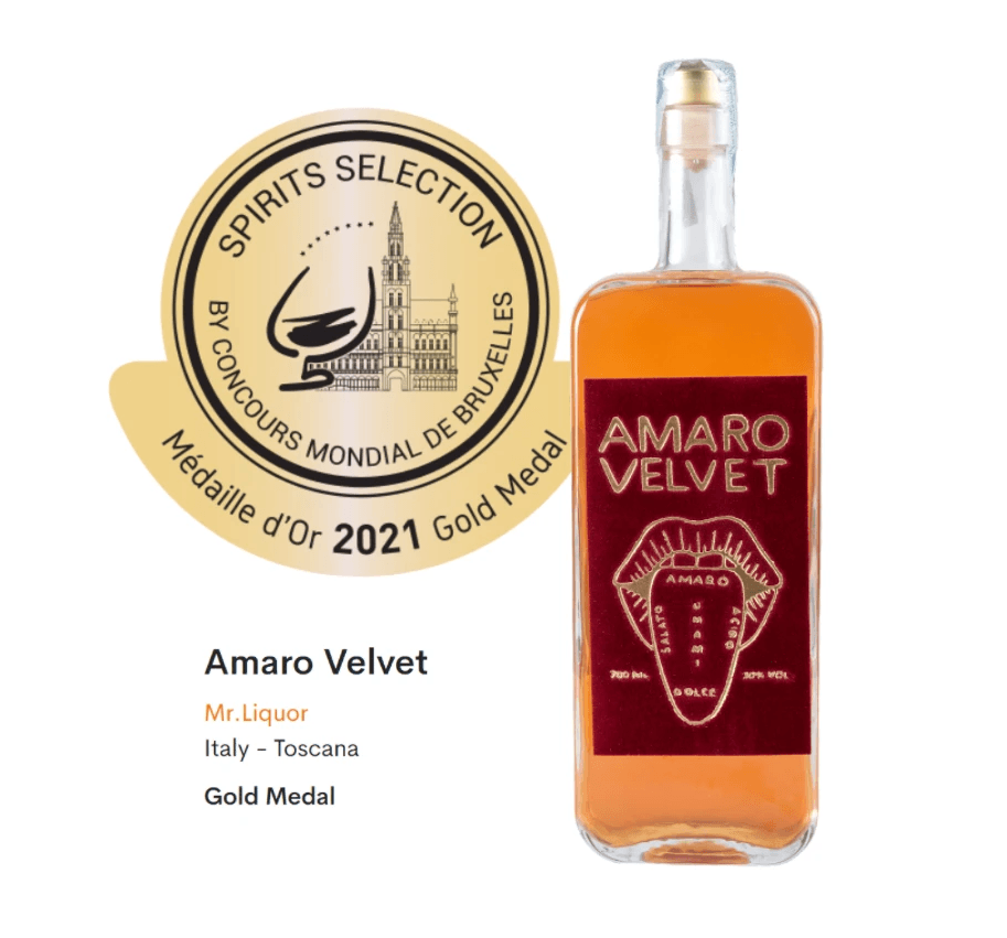 Nel 2021 Amaro Velvet conquista la Medaglia d’Oro come Miglior Amaro al Mondo alla prestigiosissima Spirit Selection di Bruxelles, il concorso internazionale dove si sfidano oltre 1500 liquori provenienti da 54 Paesi, con degustazioni alla cieca.